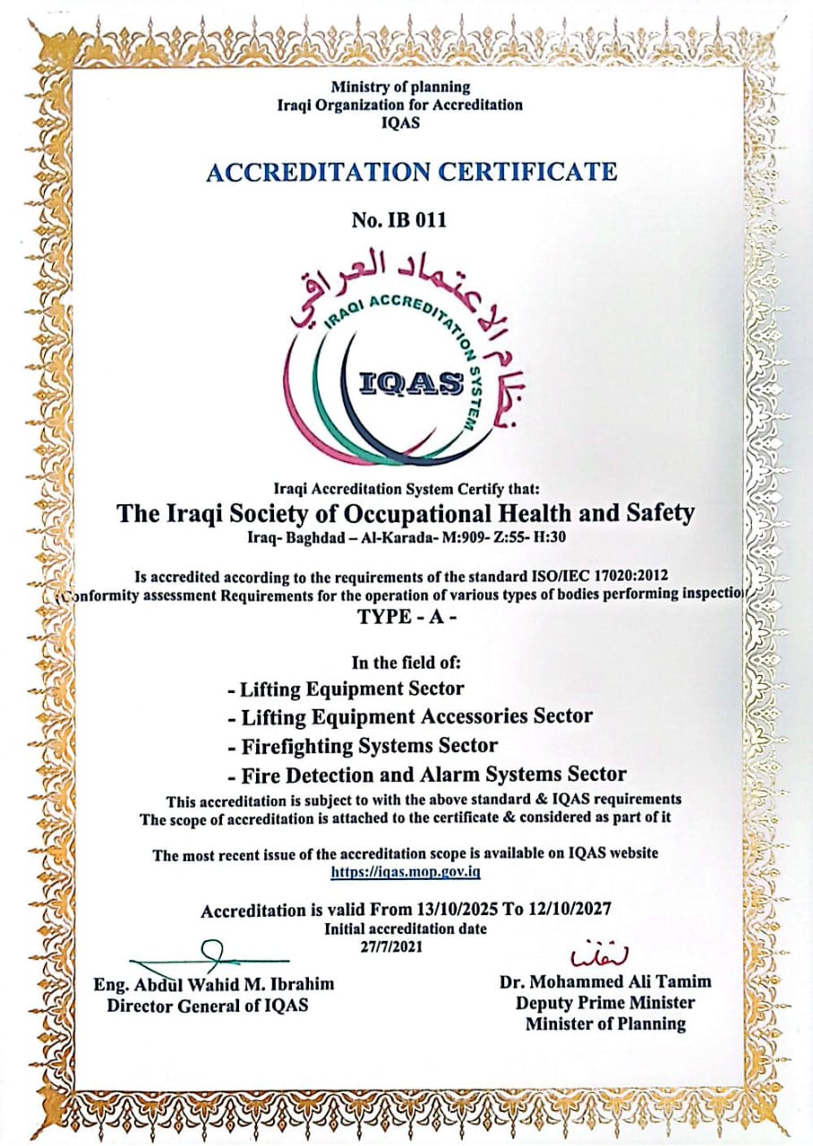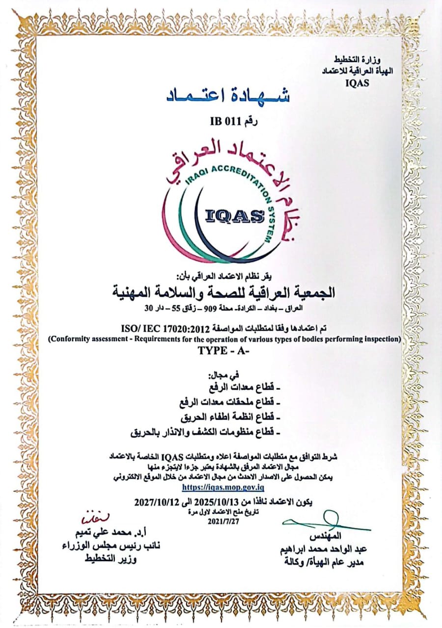 بتاريخ 28/10/2025 تم تجديد شهادة الاعتماد الممنوحة الى الجمعية من قبل الهيئة العراقية للاعتماد وتسلم السيد سعيد حسين جاسم امين سر الجمعية شهادة الاعتماد من قبل مدير عام هيئة الاعتماد المهندس عبد الواحد محمد ابراهيم